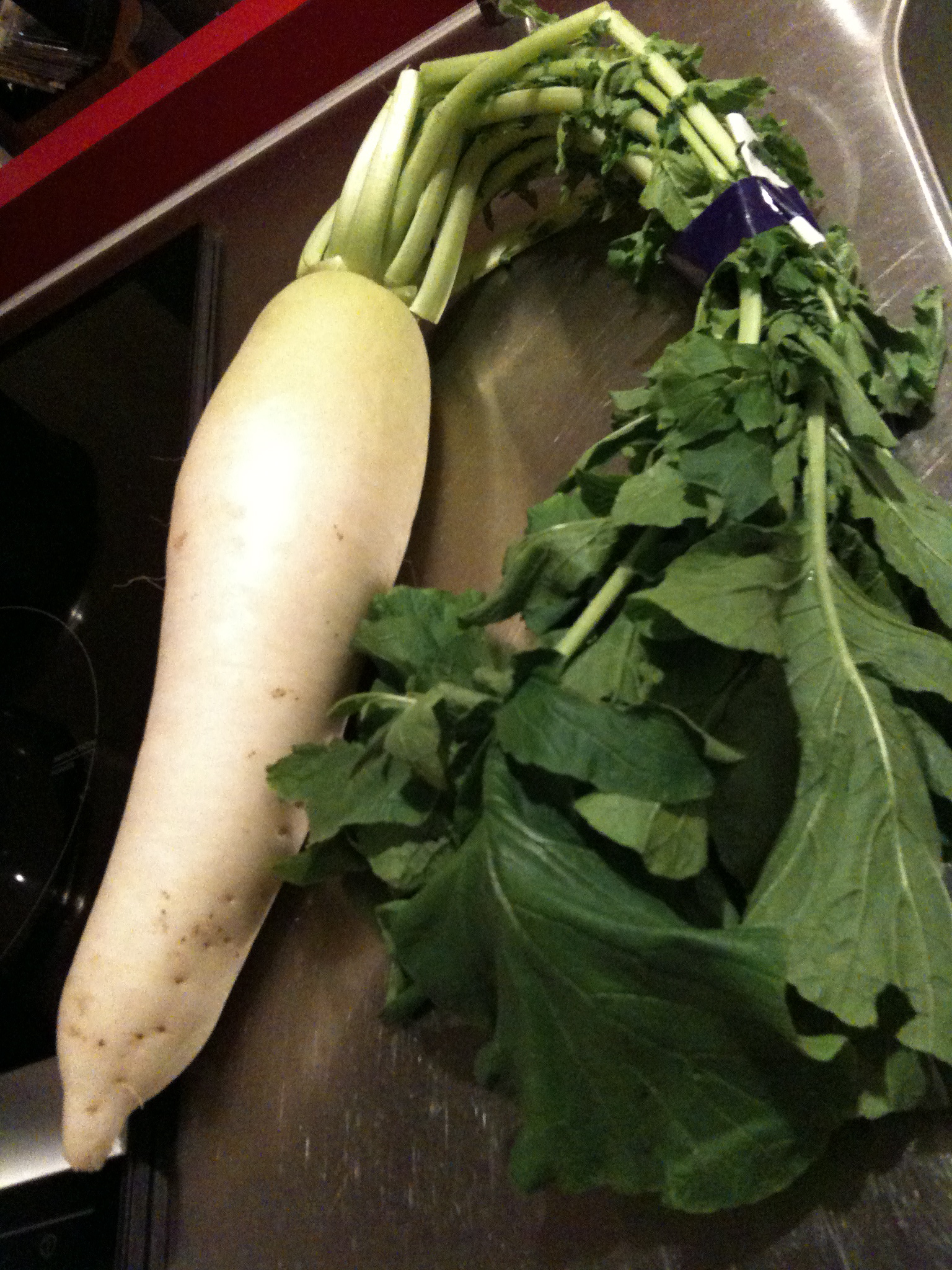 急に寒くなったので、シチューにしようっかな、と思って買った葉付き大根。袋に入れるのに折り曲げようと格闘していたら、隣で男の子がこっちをじっと見てるヨ。